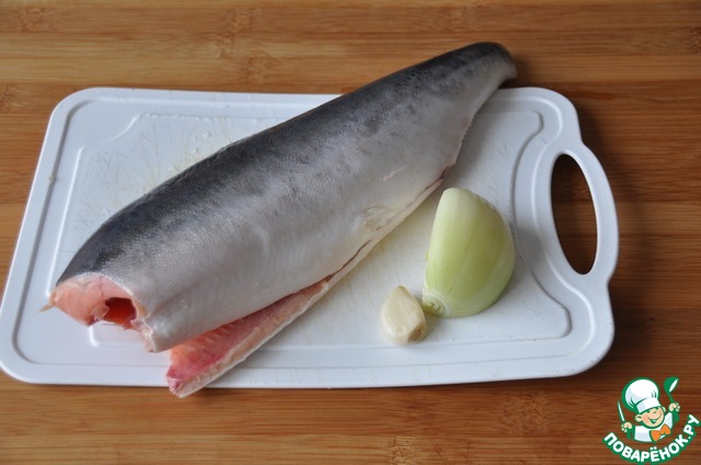Для приготовления можете брать любую красную рыбу (лососёвых пород). Я взяла самую бюджетную у нас - горбушу. Рыбу чистим. Так же чистим лук и чеснок.