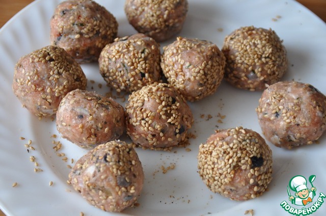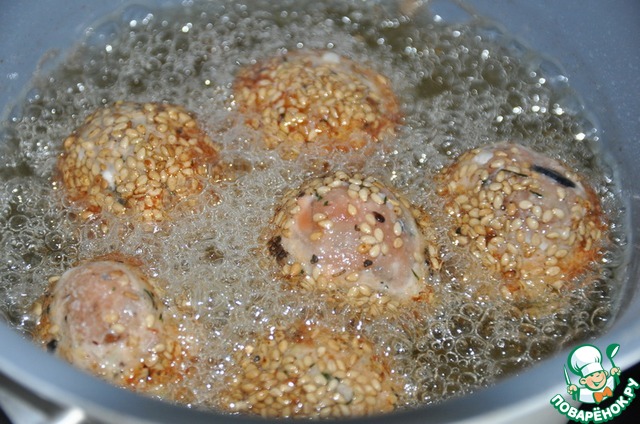 На тарелку (доску) насыпаем кунжут и катаем фрикадельки по кунжуту, чтобы он равномерно облепил их.