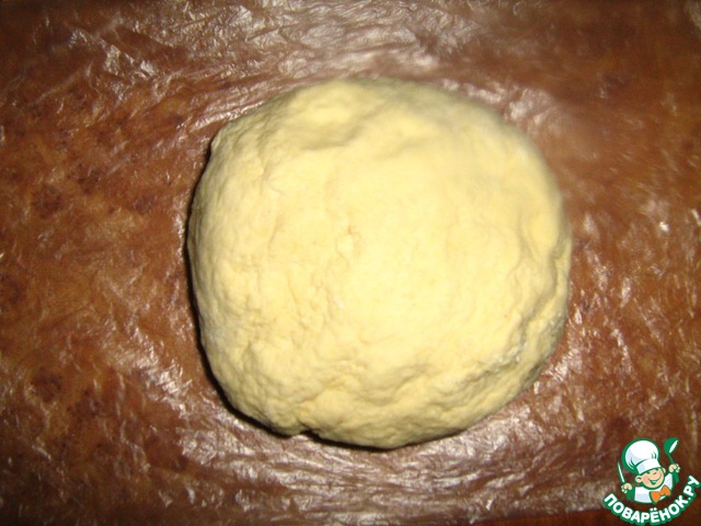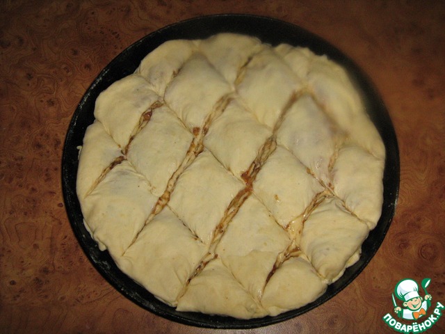 Раскатать первый шарик теста в пласт так, чтобы концы свисали с краев формы для выпечки. Форму (например, сковорода круглая, диаметр 25 см) смазать слегка подсолнечным маслом.