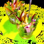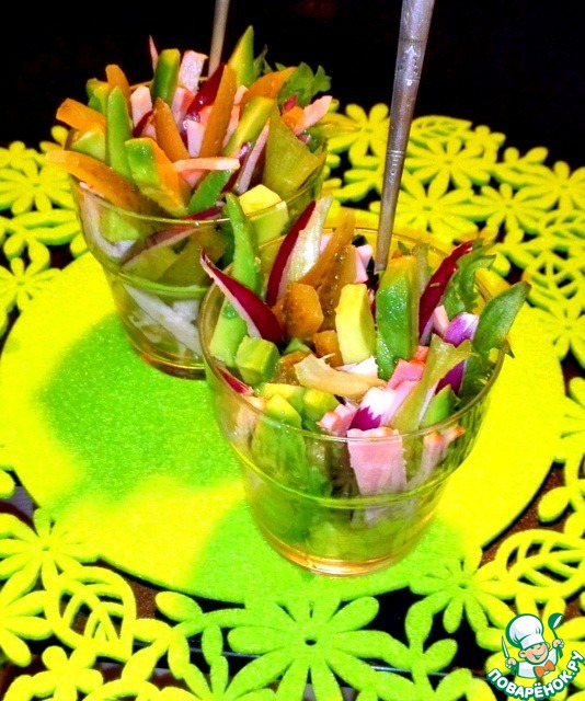 Вкусная порционная закуска из телятины с овощами! Пикантность вкусу придают маринованные огурчики, фрукты и заправка! Отлично подойдет в качестве легкого перекуса перед основными блюдами, а так же в качестве основной закуски за столом! Слово "жульен" в данном рецепте подразумевает способ нарезки!