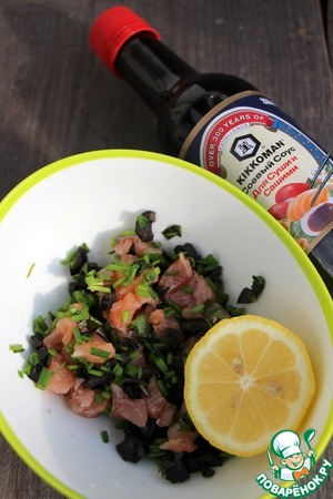 Полить соком лимона, оливковым маслом и соевым соусом ТМ "Киккоман" Для Суши и Сашими.