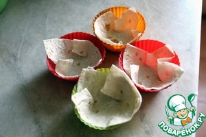Нарезать из лаваша квадратики, смазать растительным маслом, положить в силиконовые формочки и поставить в микроволновую печь на 1 минуту. Остудить.