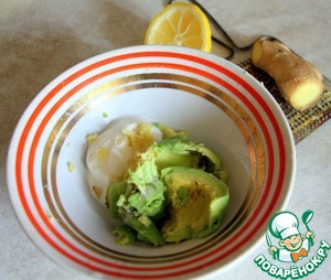 Блендером измельчить авокадо, добавить творожный сыр, натертый корень имбиря, лимонный сок и еще раз взбить блендером.