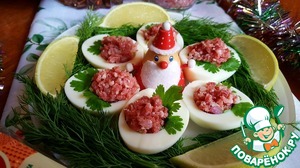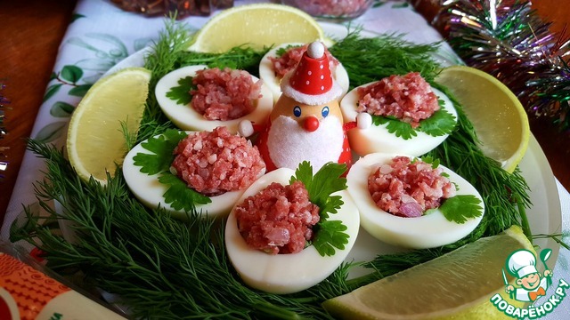 Для праздничной подачи можно выложить гнёздышко из укропа. Отлично подойдёт такая закуска к коньяку.