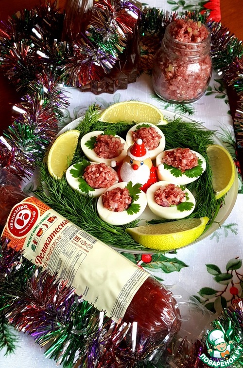 Для подачи икры в яйцах, разрезать варёное куриное, или перепелиное, яйцо на две половинки, удалить желток. Для украшения и дополнительного вкуса положить в яйцо пару листиков кинзы, петрушки или немного укропа. Сверху выложить горкой колбасную икру.