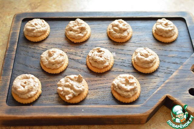 На крекеры выложить паштет (лучше использовать кондитерский мешок).