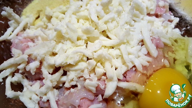 Добавить панировочные сухари, яйцо и натёртую моцареллу. Вымешать фарш.