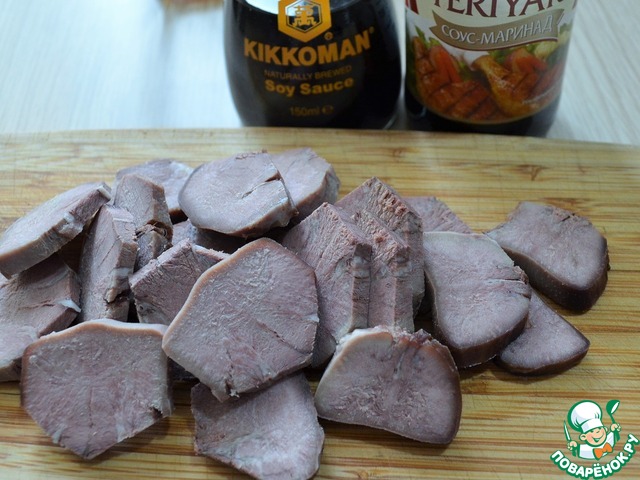 Язык нарезать на тонкие пластинки, 0,5 - 0,7 см..