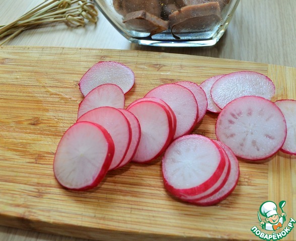 На новогоднем столе рядом с шампанским обязательно присутствует и беленькая. Без нее и застолье не застолье, именно к ней и подадим эту закуску : язык, редис и маринованный огурчик. Думаю, самое то!