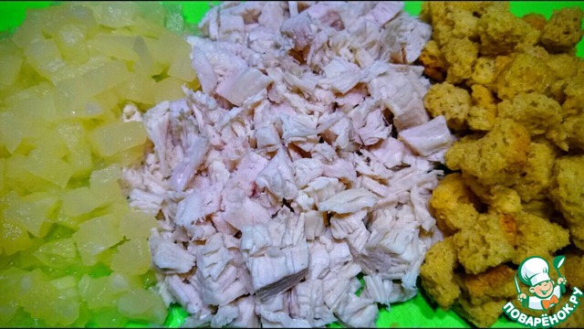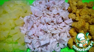 Ананас и курица мелко режутся, аккуратными кубиками, затем к ним добавляются сухарики. Все перемешивается с майонезом.