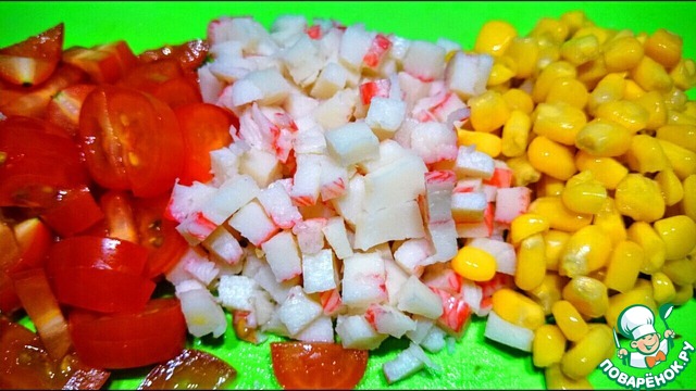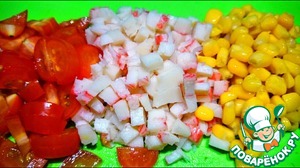 Мелко нарезаются помидоры и крабовые палочки, к ним добавляется кукуруза. Все перемешивается с майонезом.