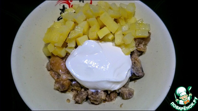 - Ананас (2 кружочка или 2 ст.л. кусочками) — 2 шт