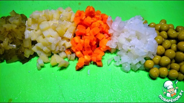 Огурец мелко нарезается, добавляется мелко нарезанный лук, затем картофель, морковь и горошек. Все перемешивается с майонезом.