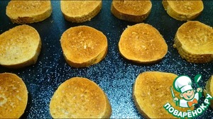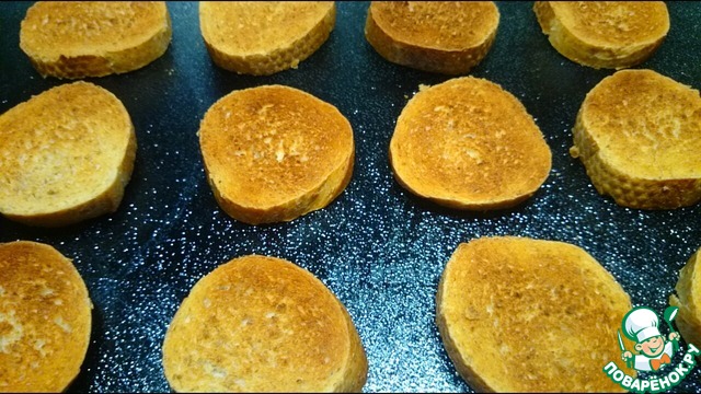 • Багет нарезается на ломтики шириной в 1 см, которые обжариваются с двух сторон под грилем.
