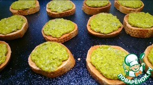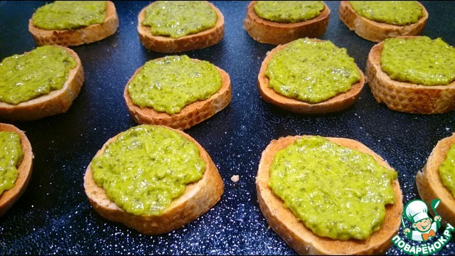 • Каждый ломтик смазывается чайной ложкой соуса песто.