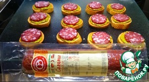• На каждый ломтик "Салями по-Черкизовски" выкладывается ломтик моцареллы, каждый шарик которой разрезается на 4 части.
