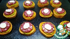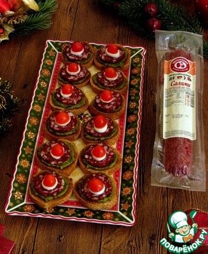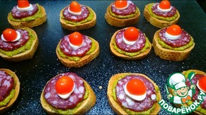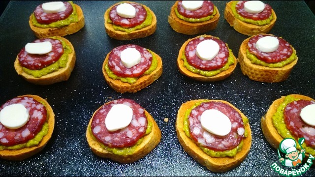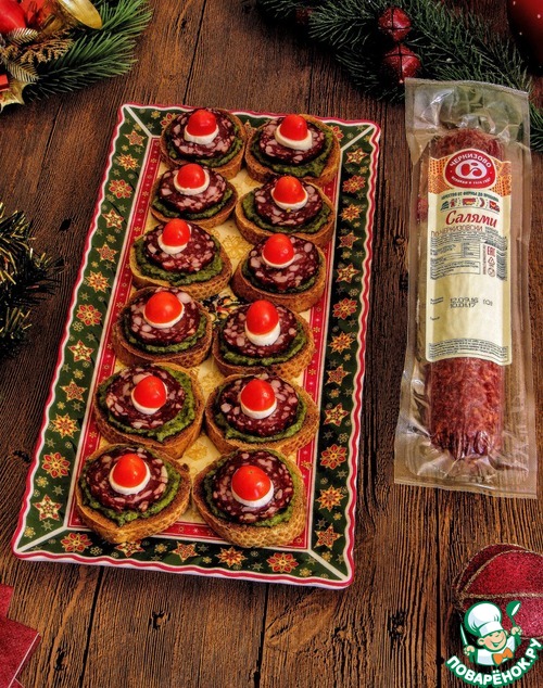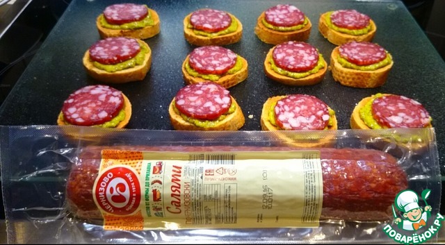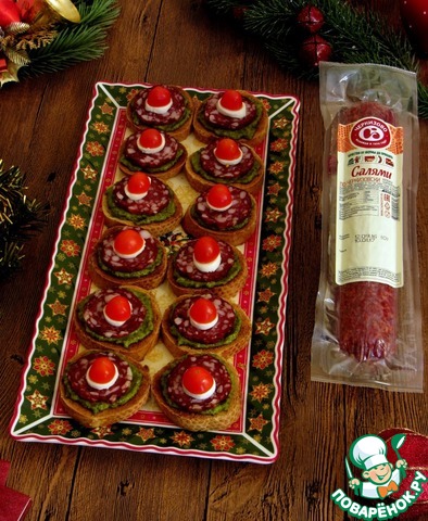 Брускетта эта создана для совершенно особого случая: хрустящий ломтик багета, нежный соус песто и "Салями по-Черкизовски"... ммм... просто мечта, просто сказка... новогодняя мечта, новогодняя сказка!!!