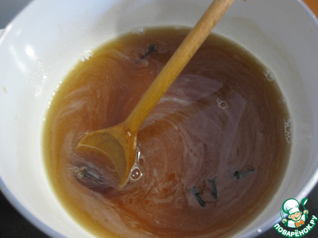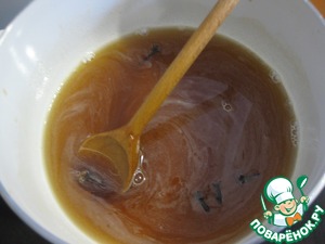 В сотейнике смешаем мед, сахар, соевый соус и воду, добавим гвоздичку, доведем до кипения