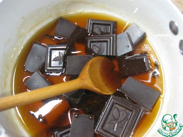 По истечению времени, мандарины достать, выложить на блюдо, в сироп добавить разломанный на кусочки шоколад и прогреть до полного растворения шоколада ( на фото шоколада больше, - просто мне эта смесь нужна была еще и для другого десерта))