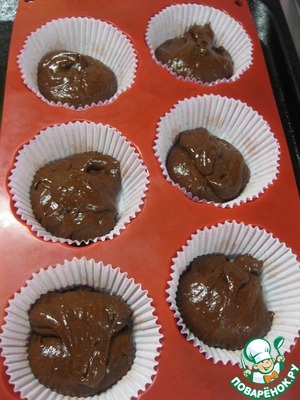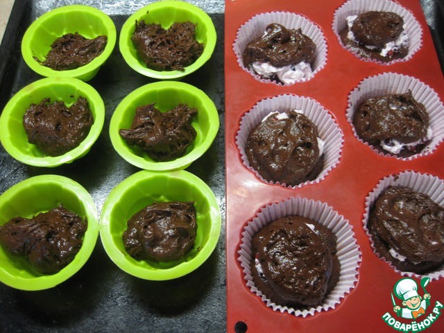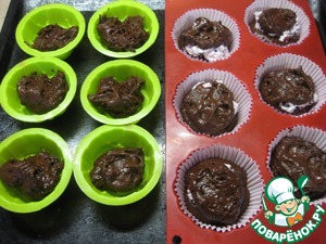 И сверху снова закрываем шоколадным тестом, формы заполняем на 2/3, еще 6 формочек я сделала без начинки