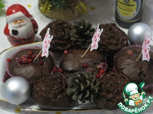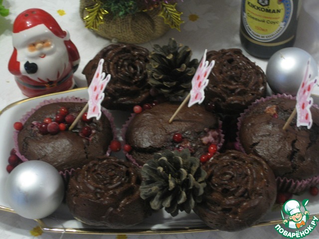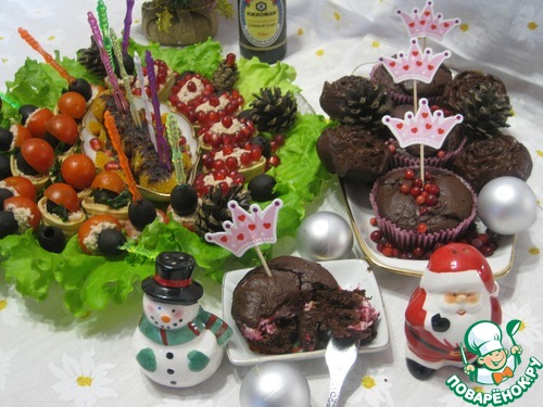 Как же в Новогоднюю ночь, да без выпечки! Мы же русские люди привычные в эту самую волшебную ночь есть так, как-будто год не ели)). Ну, а раз у нас фуршет, то мы испечем маленькие мега-шоколадные кексики с брусничкой, да еще и с сюрпризом внутри! Заходите, пробуйте! Угощаю!