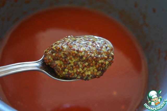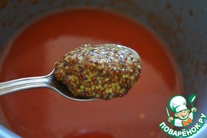 В томатном соке замочите желатин на 1 час, добавьте сюда же соль, сахар, зерновую горчицу, перец