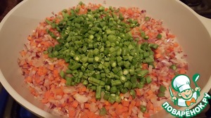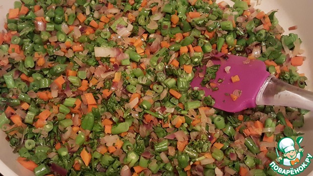 Подготовить овощи. Лук и морковь почистить и мелко нарезать, у стручковой фасоли отрезать хвостики и мелко нарезать. Разогреть в сковороде ложку топленого масла, выложить нарезанный лук. Обжарить, помешивая пару минут. Добавить морковь и обжарить ещё пару минут на среднем огне, помешивая. Добавить фасоль, накрыть крышкой и тушить до мягкости фасоли, буквально минутку.