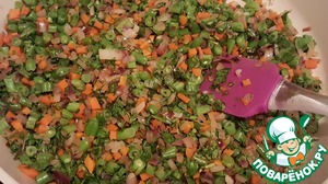 Нарезать сосиски чуть крупнее, чем овощи. Добавить нарезанные сосиски к овощам и перемешать. Начинка готова.