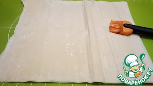 Тесто фило. Я выкладываю стопку листов фило на силиконовый коврик, смазываю верхний лист маслом, затем переворачиваю этот лист, таким образом у меня получается два листа смазанных маслом.