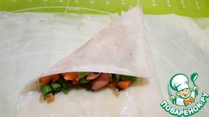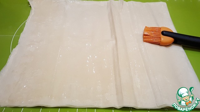 Сворачиваем лист теста фило с обеих сторон к центру, получается полоска теста шириной 1/3 листа. -