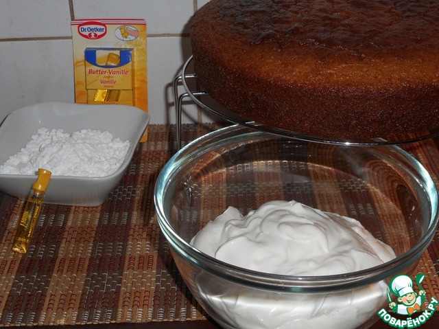 Сметана должна быть охлаждённой, свежей. Взбиваем сметану миксером. По одной ложке добавляем просеянную сахарную пудру, ванильный ароматизатор.