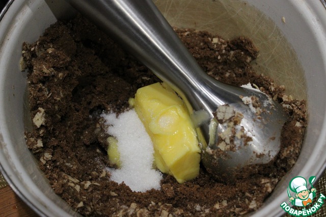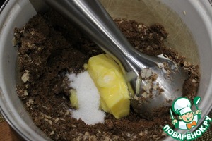 Для основы в вафли, измельченные блендером, добавить размягченное сливочное масло и сахар. Мешать, пока смесь не станет однородной.