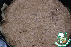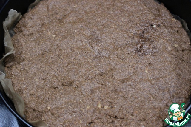Разъемную форму диаметром 24 см смазать сливочным маслом. Дно устелить промазанным маслом пергаментом и утрамбовать по дну нашу основу. Отправляем в разогретую до 200 градусов духовку на 7 минут. Вынуть основу, духовку не выключать.
