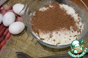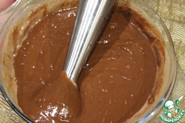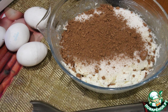 Творог взбейте блендером с какао и сахаром. Продолжая взбивать, добавляйте по одному яйца.