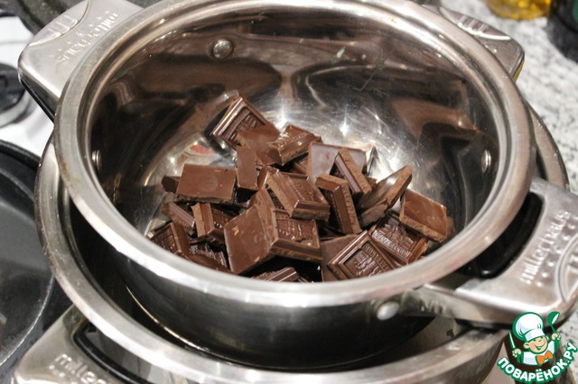 Большую кастрюлю наполните водой на 1/3, поставьте на огонь. Пусть она слабо кипит. Шоколад разломать в кастрюлю размером поменьше и растопить на водяной бане.