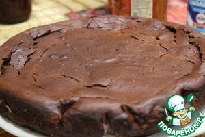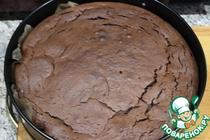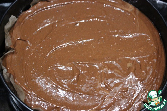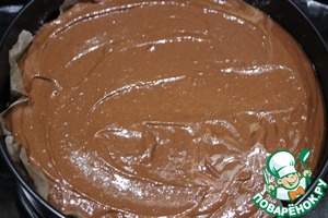 Чуть остывший шоколад вмешать блендером в начинку. И теперь самое сложное в рецепте - не съесть начинку! Вспомним про сырые яйца в составе, про голодных детей и домочадцев, которым был обещан чизкейк, берем себя в руки и выливаем начинку в форму. Разравниваем.