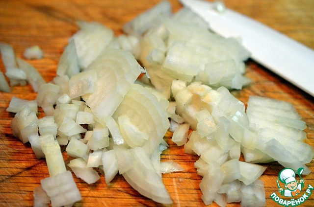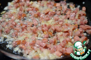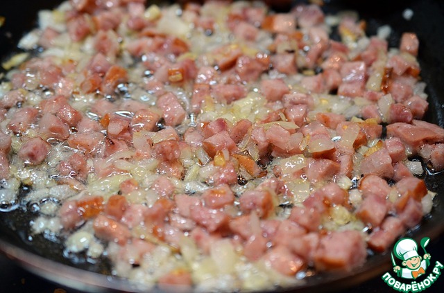 Колбаски нарежьте мелкими кубиками. Я использую полукопчёную колбасу "Охотничья по-Черкизовски". Она сделана из натурального мяса и обладает высокими вкусовыми качествами.