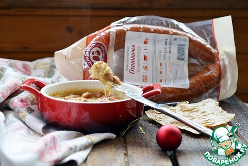 Необыкновенно ароматный соус-дип с сыром и копчеными колбасками по достоинству может украсить Ваш Новогодний стол. Отлично сочетается с крекерами, сухариками, лавашом и просто с хлебом.