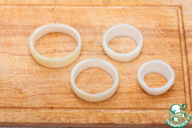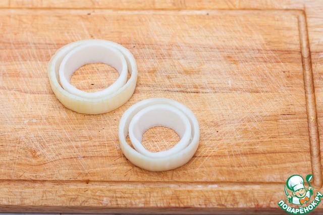 Лук очистить, нарезать толстыми колечками. Я разрезала луковицу на 3 части, но можно и на 4. Все зависит от величины луковицы и вашего желания.