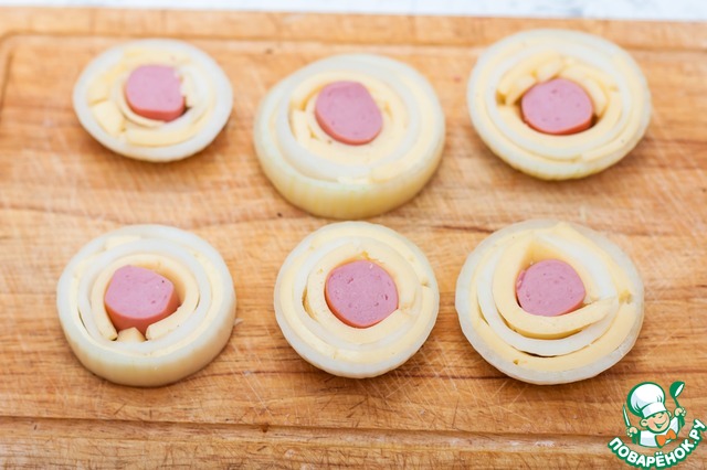 Вот так должно получиться. Эти 6 колец получились с одной луковицы. Сыр и сосиска должны держаться в луке плотно, тогда они не будут выпадать при панировке.