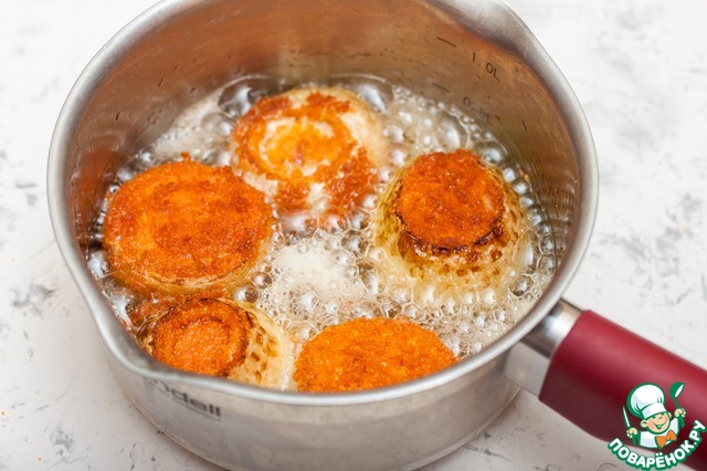Кольца аккуратно обмакнуть во взбитое яйцо и запанировать в сухарях. Сухари лучше брать покупные, крупного помола, с ярким цветом, они плотные и остаются хрустящими даже тогда, когда закуска остывает.