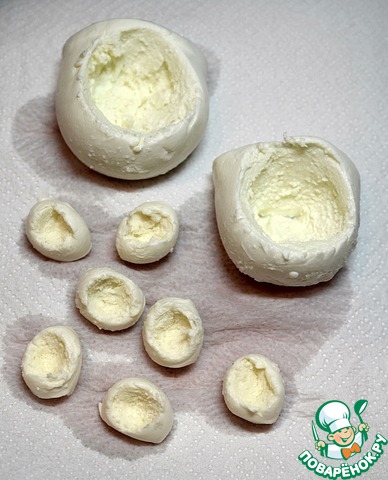 • Моцареллу выложить на бумажное полотенце. Сделать при помощи чайной ложки сверху углубления.