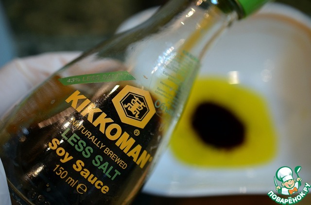 • Для заправки смешать масло, слитое с вяленых томатов, и соевый соус. Я использую лёгкий соевый соус ТМ Kikkоmаn.