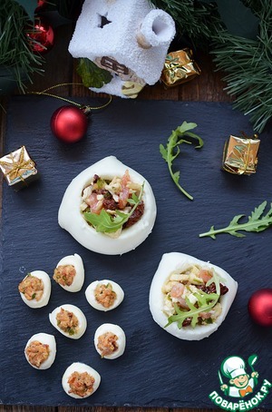 • Выкладываем начинку в углубления на сыре.
