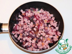 • 4. Нарезать небольшими кубиками ветчину и добавить в сковороду, перемешать.