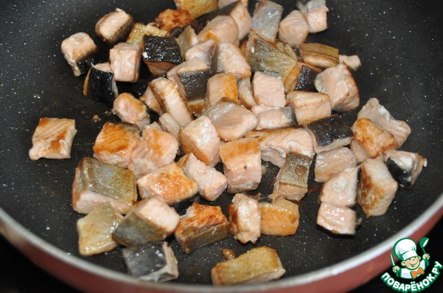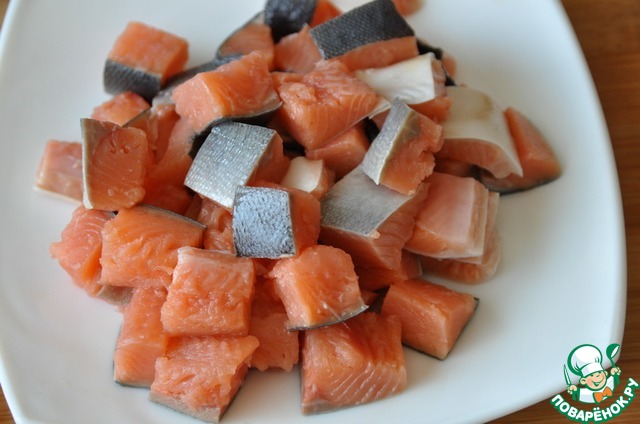 Для приготовления берём любую рыбу лососёвых пород по вашему вкусу и возможностям. У меня самая бюджетная - горбуша. Рыбу чистим, разделываем на филе, режем кубиками размером около 1,5 см. Кожу рекомендую оставить, она не жёсткая у горбуши. А без кожи кусочки будут разваливаться при жарке.