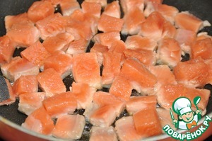 На среднем огне жарим кусочки рыбы, чтобы они подрумянились со всех сторон. Общее время составляет 5 минут, не пересушите.