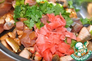 В миску кладём жареную остывшую рыбу, копчёную рыбу, нарезанный маринованный имбирь и зелень кинзы.