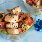 Рыбные блюда очень популярны на Новогоднем столе. Для любителей кухни с японским акцентом предлагаю оригинальный салат из рыбки двух видов с необычным ингредиентом - маринованным имбирем.