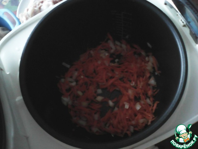 Лук с морковью обжарить на небольшом количестве растительного масла в мультиварке в режиме "Выпечка" 20 мин до золотистости